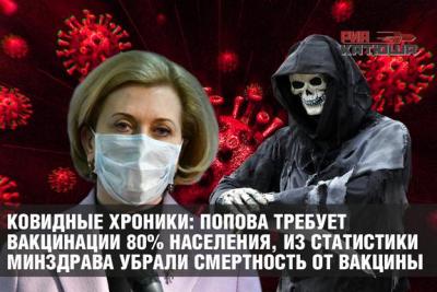 Недавняя отмена обязательных QR-кодов в Москве вовсе не означает, что власти РФ отказались от участия в глобалистском проекте «коронабесие». Задача, поставленная нашей колониальной «элите», по тотальному прокалыванию экспериментальными препаратами, внедрению дистанта, локдаунов и т.п. никуда не делась. Партия коронавируса не отступила, а лишь перегруппировалась и бросилась в новую атаку, требуя вакцинации уже 80% населения, отправить всех старшеклассников к Грефу на дистанционное обучение, а дабы никто не возмущался и отчеты цвели и пахли, в методических рекомендациях для главврачей запретили вести статистику смертей от прививок. К счастью, общество начинает прозревать и понимать суть происходящего