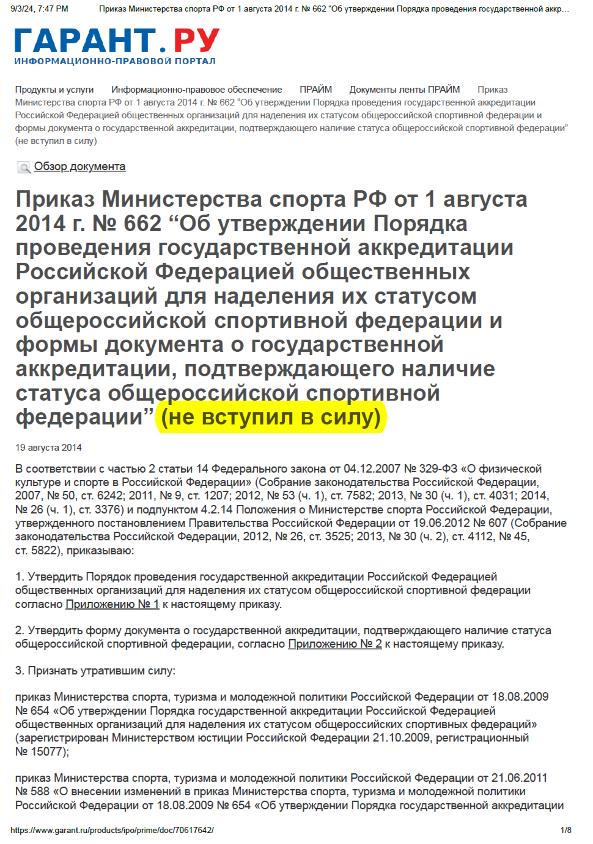 Приказ Министерства спорта Российской Федерации от 1 августа 2014 г. № 662 “Об утверждении Порядка проведения государственной аккредитации Российской Федерацией общественных организаций для наделения их статусом общероссийской спортивной федерации и формы документа о государственной аккредитации, подтверждающего наличие статуса общероссийской спортивной федерации” (зарегистрирован Министерством юстиции Российской Федерации 5 августа 2014 г., регистрационный № 33457), дата публикации в Российской газете 26.08.2014 г., который не был опубликован в сроки по Указу Президента РФ от 23 мая 1996 г. N 763 "О порядке опубликования и вступления в силу актов Президента Российской Федерации, Правительства Российской Федерации и нормативных правовых актов федеральных органов исполнительной власти", согласно п. 9. Нормативные правовые акты федеральных органов исполнительной власти в течение 10 дней после дня их государственной регистрации подлежат официальному опубликованию в"Российской газете", можно признавать ничтожными и не действительными, а деятельность всех аккредитованных федераций , начиная с 1 августа 2014 года, забалансовой и незаконной а рамках применимого в Российской Федерации законодательства.