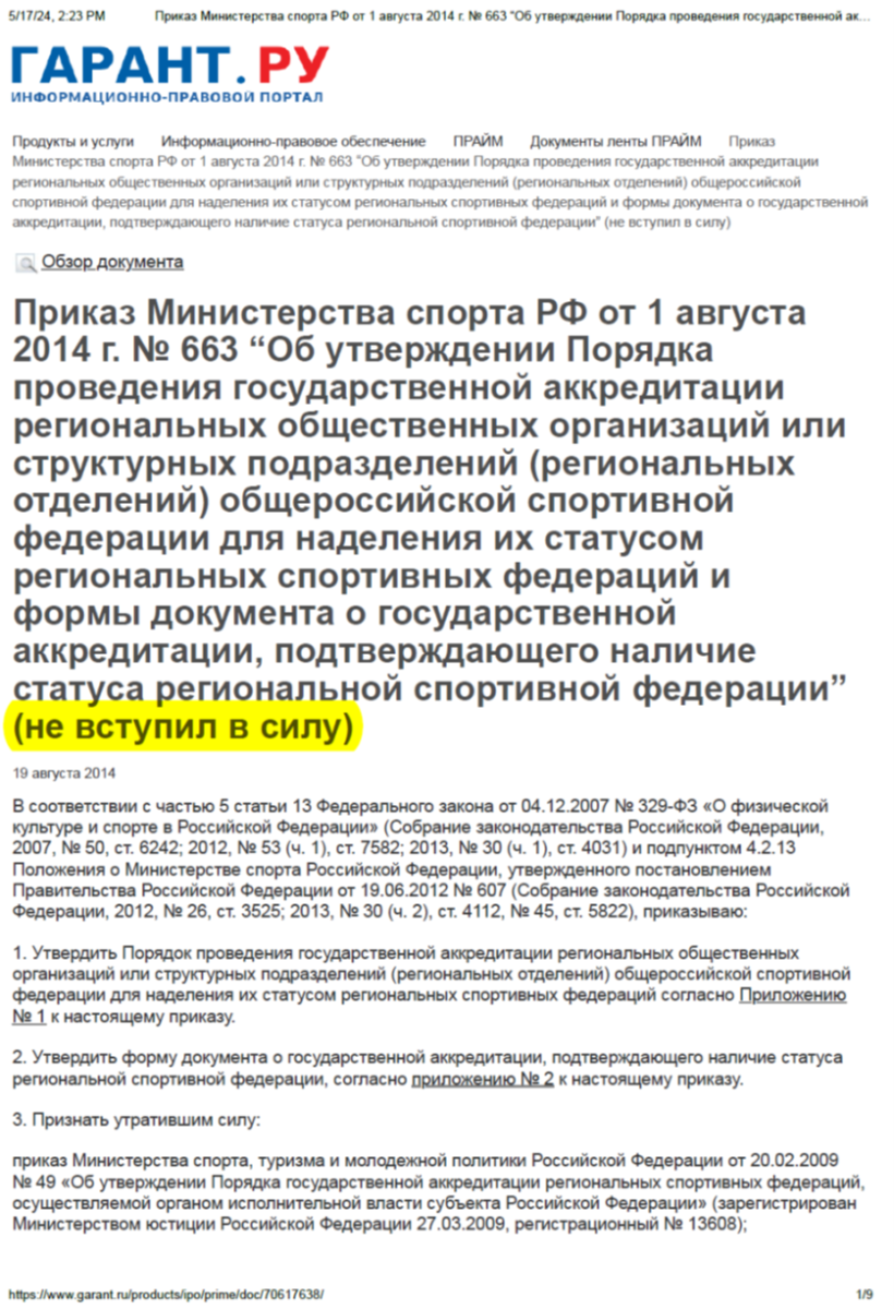 Аналогичным образом, по применимому и действующему законодательству Российской Федерации, согласно пунктам 9 и 10 Указа Президента РФ от 23 мая 1996 г. N 763 "О порядке опубликования и вступления в силу актов Президента Российской Федерации, Правительства Российской Федерации и нормативных правовых актов федеральных органов исполнительной власти", Приказ Министерства спорта РФ от 1 августа 2014 г. № 663 “Об утверждении Порядка проведения государственной аккредитации региональных общественных организаций или структурных подразделений (региональных отделений) общероссийской спортивной федерации для наделения их статусом региональных спортивных федераций и формы документа о государственной аккредитации, подтверждающего наличие статуса региональной спортивной федерации» также не вступил в силу, зарегистрирован в Минюсте России 05.08.2014, регистрационный № 33458, опубликован в «Российской газете» 10 сентября 2014 г. № 205.