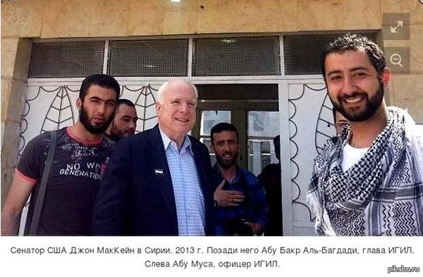 Вот незадача, интернет полон совместных фотографий американского сенатора Джона Маккейна с Аль-Багдади и его соратниками, а вот ни одной совместной фотографии с руководством ИГИЛ, например Валентины Матвиенко или Алексея Пушкова найти мне так и не удалось. Чем больше ложь, тем скорее в нее поверят — с учетом выбора Украиной вектора «демократического» развития, этой фразой вся политики МИД Украины и определяется.