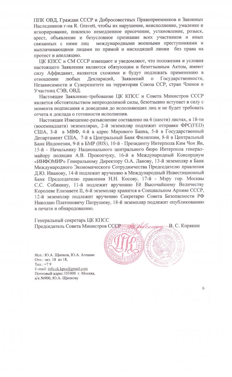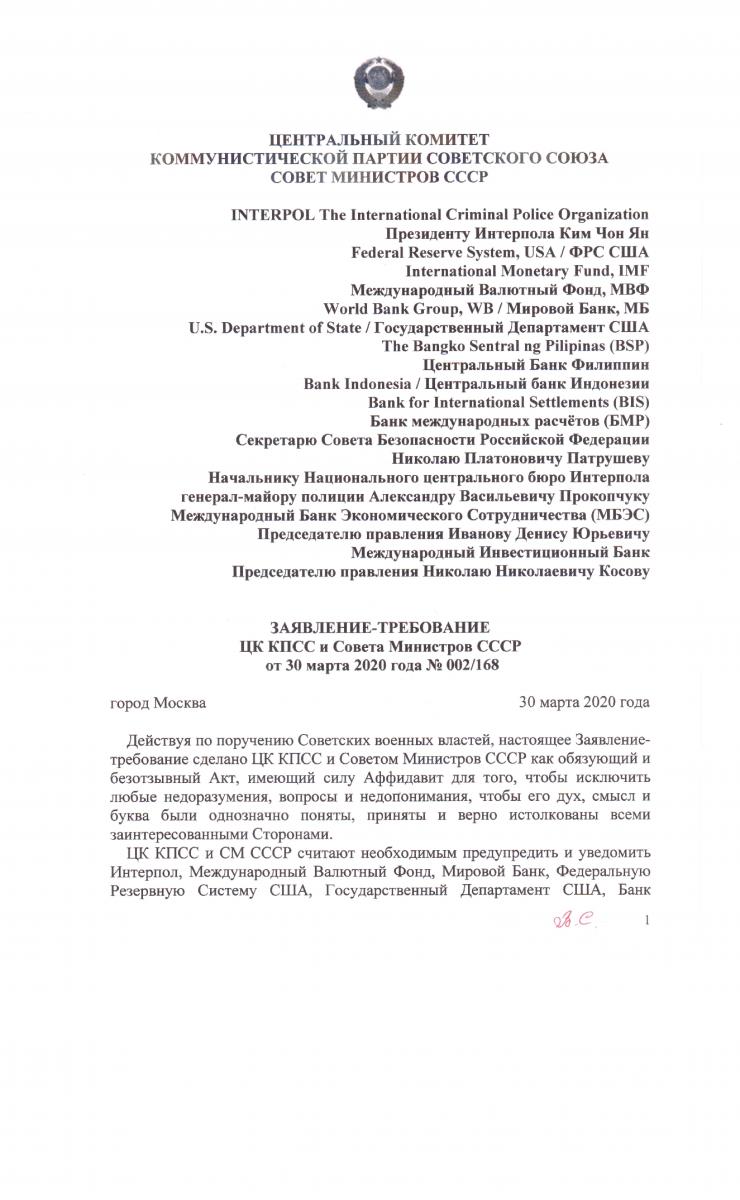 » ЦК КПСС и СМ СССР. Заявление-требование от 30 марта 2020 года № 002/168