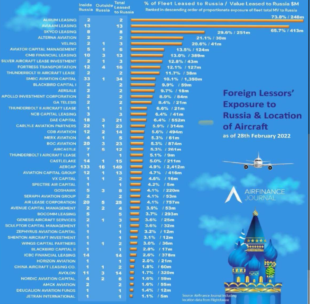 Airfinance Journal выкладывал такую, довольно подробную диаграмму с количеством самолетов, находящихся в операционном лизинге в российских авиакомпаниях, и сколько это «железо» стоит.