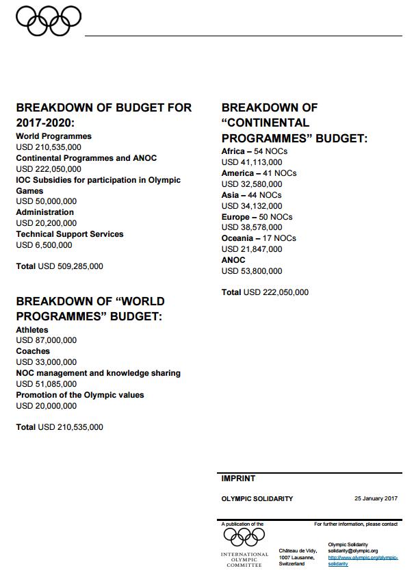 budget approved by the Olympic Solidarity Commission for the 2017-2020 period totals USD 509,285,000, which is 16 per cent higher overall than the budget for the previous plan…