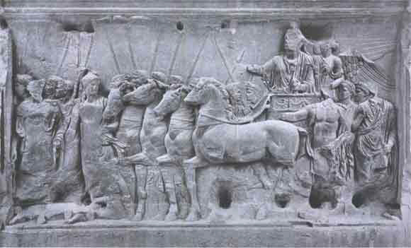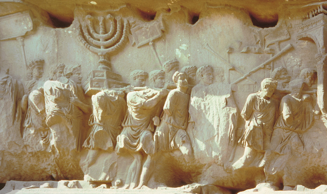 Тит въезжает в город на колеснице, а его воины несут знаменитый священный Семисвечник и другие святыни из сожжённого и разграбленного Иерусалимского храма.