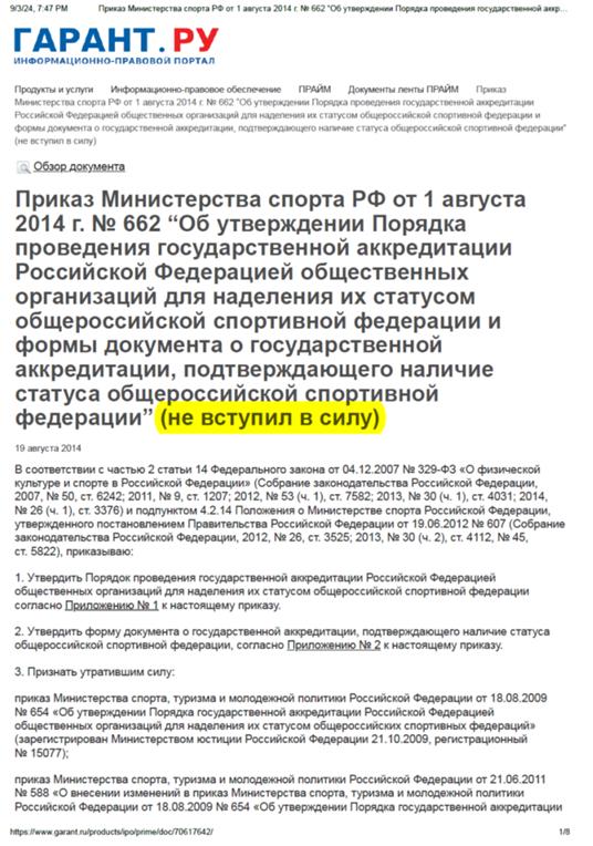 Приказ Министерства спорта Российской Федерации от 1 августа 2014 г. № 662 (зарегистрирован Министерством юстиции Российской Федерации 5 августа 2014 г., регистрационный № 33457), дата публикации в Российской газете 26.08.2014 г., который не был опубликован в сроки по Указу Президента РФ от 23 мая 1996 г. N 763 "О порядке опубликования и вступления в силу актов Президента Российской Федерации,Правительства Российской Федерации и нормативных правовых актов федеральных органов исполнительной власти", согласно п. 9. Нормативные правовые акты федеральных органов исполнительной власти в течение 10дней после дня их государственной регистрации подлежат официальному опубликованию в"Российской газете" или на "Официальном интернет-портале правовой информации"(www.pravo.gov.ru). Официальным опубликованием нормативных правовых актов федеральных органов исполнительной власти считается первая публикация их полных текстов в "Российской газете" или первое размещение (опубликование) на "Официальном интернет-портале правовой информации"(www.pravo.gov.ru) и п. 10. Нормативные правовые акты федеральных органов исполнительной власти, кроме актов и отдельных их положений, содержащих сведения, составляющие государственную тайну, или сведения конфиденциального характера, не прошедшие государственную регистрацию, а также зарегистрированные, но не опубликованные в установленном порядке, не влекут правовых последствий, как не вступившие в силу, и не могут служить основанием для регулирования соответствующих правоотношений, применения санкций к гражданам, должностным лицам и организациям за невыполнение содержащихся в них предписаний. На указанные акты нельзя ссылаться при разрешении споров.