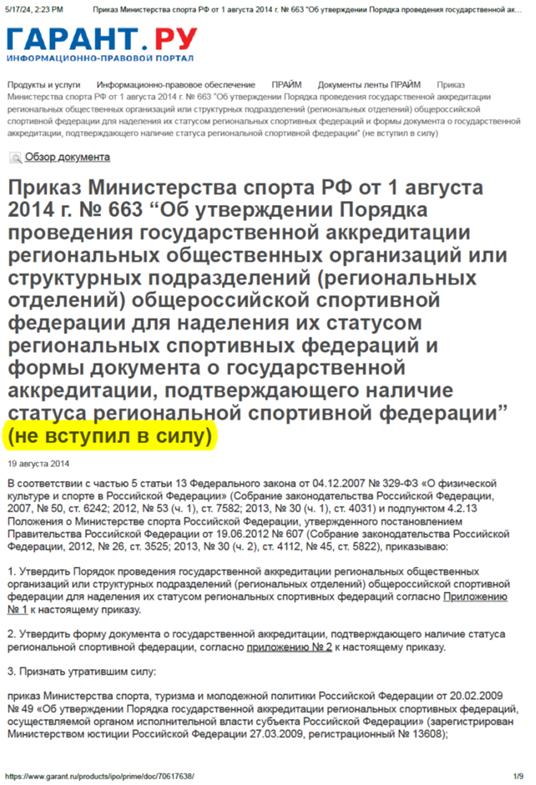 Аналогичным образом, по применимому и действующему законодательству Российской Федерации, согласно пунктам 9 и 10 Указа Президента РФ от 23 мая 1996 г. N 763 "О порядке опубликования и вступления в силу актов Президента Российской Федерации,Правительства Российской Федерации и нормативных правовых актов федеральных органов исполнительной власти", Приказ Министерства спорта РФ от 1 августа 2014 г. № 663 “Об утверждении Порядка проведения государственной аккредитации региональных общественных организаций или структурных подразделений (региональных отделений) общероссийской спортивной федерации для наделения их статусом региональных спортивных федераций и формы документа о государственной аккредитации, подтверждающего наличие статуса региональной спортивной федерации также не всупил в силу, зарегистрирован в Минюсте России 05.08.2014, регистрационный № 33458, опубликован в «Российской газете» 10 сентября 2014 г. № 205.