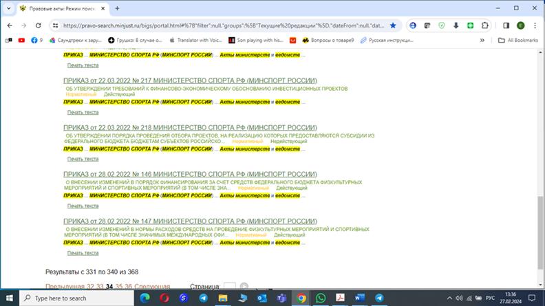 Скрин с сайта Минюста РФ https://pravo-search.minjust.ru, подтверждающий отсутствие Государственной аккредитации Федерации регби России по Приказу Министерства спорта Российской Федерации № 158 от 01.03.2022 о государственной аккредитации, которой не прошёл регистрацию в Министерстве Юстиции РФ, отсутствует в ГИС, что в свою очередь свидетельствует о сфальсифицированной аккредитации
