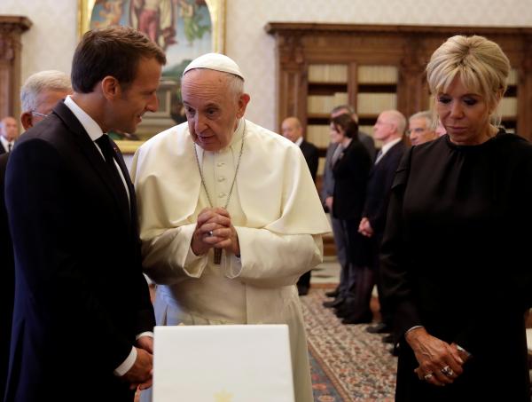 Внутри дворца их встретил префект Папского двора, который проводил их к Папе Римскому Франциску. «Добро пожаловать! Soyez le bienvenu!», — обратился к Макрону по-французски понтифик. Благожелательное приветствие журналисты отчасти объясняют тем фактом, что в последние месяцы французский президент неоднократно заявлял о желании сблизить институты государства и церкви. Такая позиция, по мнению журналистов Le Monde, «без сомнения успокоила Папу»: еще в мае 2016 года в интервью изданию La Croix понтифик упрекал Францию в «преувеличенной светскости».