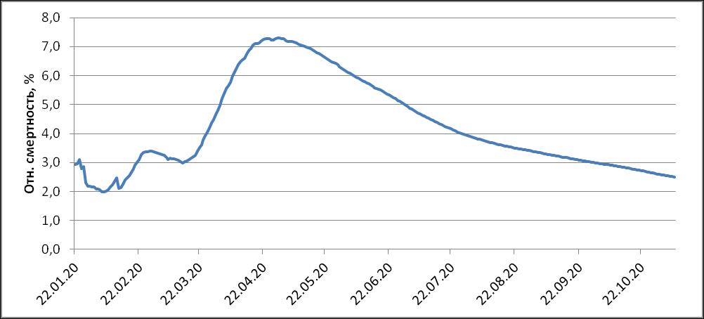 По состоянию на 07.11.2020 относительная смертность от общего числа заболевших в мире снизилась до 2,5%, хотя в максимуме она была 7,3%. При этом общее число заболевших в этот день было всего 0,64% от населения Земли. По данным ВОЗ на начало октября около 10% жителей планеты, вероятно, были заражены коронавирусом (в основном как вирусоносители), и их приблизительно в 20 раз больше общего числа заболевших в то время. В таком случае относительная смертность от общего числа зараженных составляет около 0,125%. При первом варианте по небольшому общему числу заболевших и умеренной относительной смертности мы имеем вспышки обычного жесткого сезонного ОРВИ. При втором варианте по достаточно большому общему числу зараженных и низкой относительной смертности мы имеем эпидемию ОРВИ на уровне обычной эпидемии гриппа.