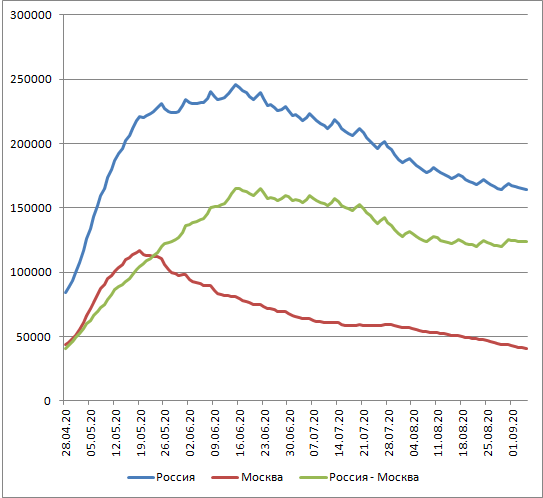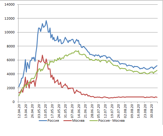 Если сравнить эти значения с приведенными на графике числами для Москвы за май-август, то окажется, что формально эпидемии в Москве не было.