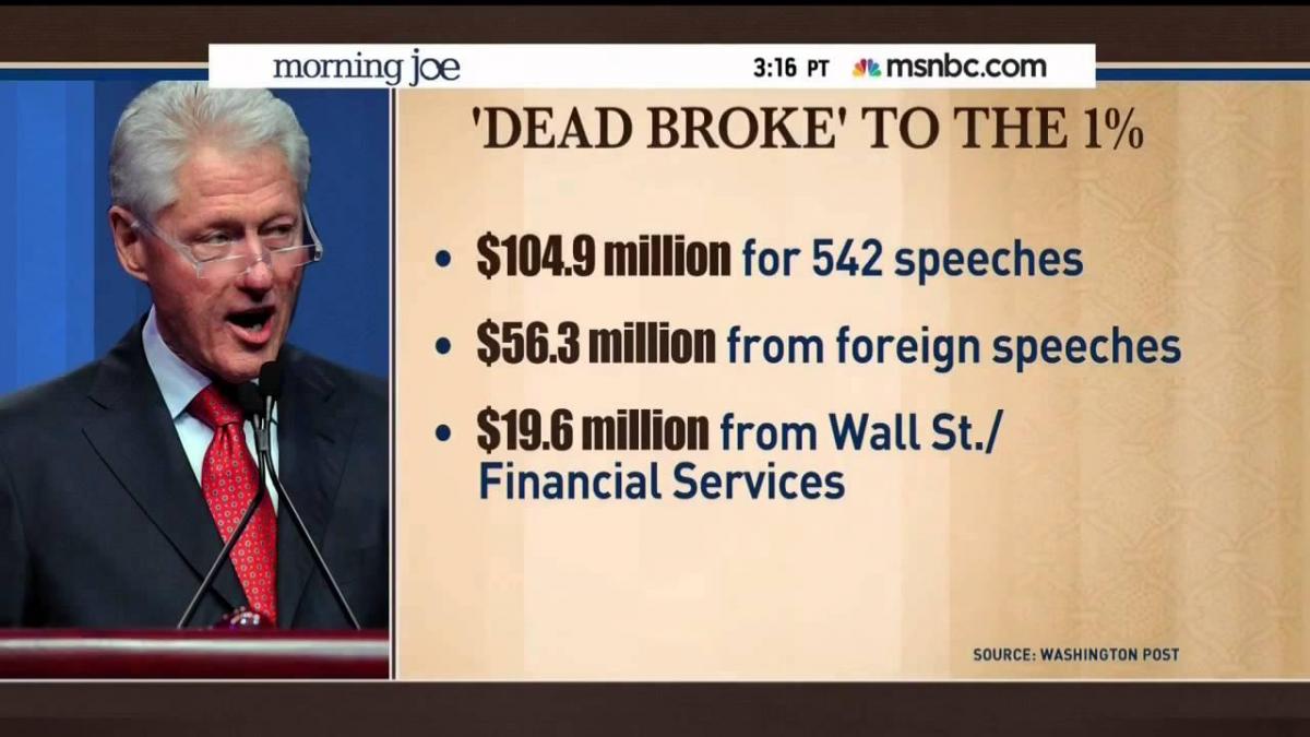 Большинство из желающих послушать членов знаменитой семьи - это представители WallStreet, крупнейшие банки и компании. Стоимость выступления начинается примерно со $ 175 000 и доходит до $500 000 и более за один выход перед публикой. За период с 2001 по 2012 год Бил Клинтон наговорил как минимум на 105 миллионов американских долларов. Только на речах в финансовых институтах WallStreet Клинтон заработал по крайней мере около 20 млн. Почему он стал пользоваться такой популярностью? Что помогло будущим спонсорам известной пары политиков забыть даже грозивший Президенту импичментом адюльтер-скандал с Моникой Левински, после которого в истории остался разве что анекдот: "Что Билл говорит Хилари после секса? - Буду дома через 20 минут". Злые языки предполагают, что он попал в милость к финансистам, когда в 1999 году, на закате своего президентского срока, протолкнул в конгрессе отмену закона Гласса-Стигала (Glass-SteagallAct).
