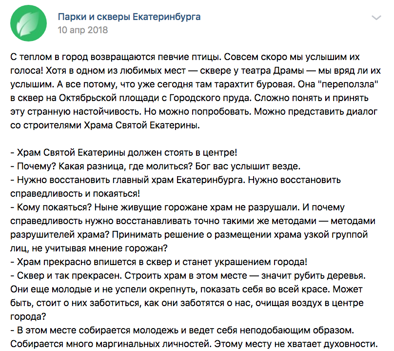 Первой ласточкой протестов стала критическая публикация о грядущей стройке, сделанная 10 апреля минувшего года на сетевой площадке «Парки и скверы Екатеринбурга», где объединились местные активисты-экологи.