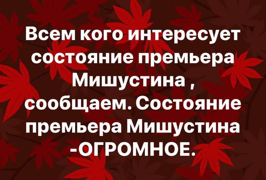 Злые языки болтают, что Мишустин сбежал через Внуково3 на чужом частном самолете как +1 пассажир. По слухам, в Москве объявили о его «болезни», когда частный самолет уже приземлился в Швейцарии, но я в эти слухи не верю, не могли же наши доблестные спецслужбы допустить, чтобы он сбежал и увел с собой «всю цифровую кассу» РФии? Или он и правда сбежал, и сейчас его заманивают назад, изображая покорность и продление карантинных мер, в надежде добраться до денег Рфии. Похоже, что дела обстоят еще хуже, - нет Мишустина — нет и денег у РФии...
