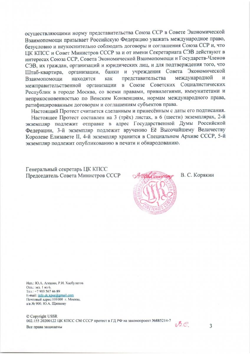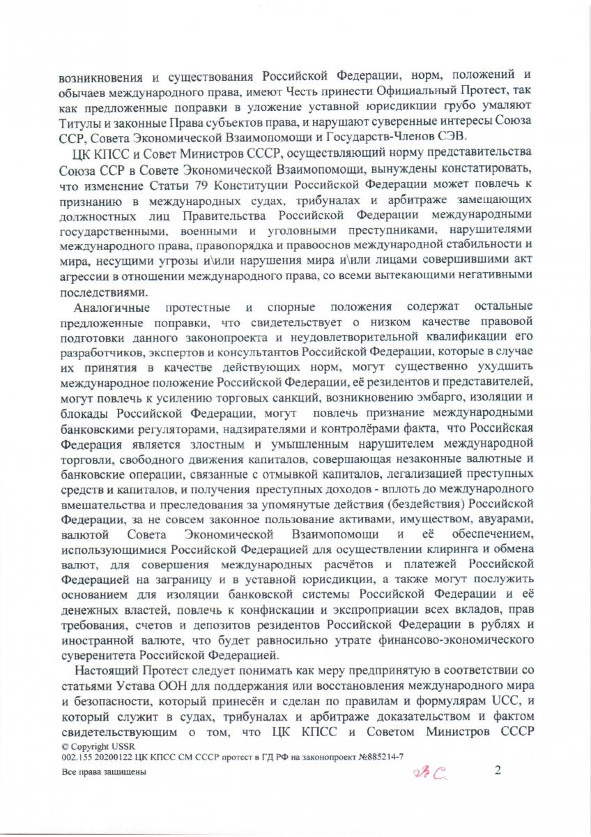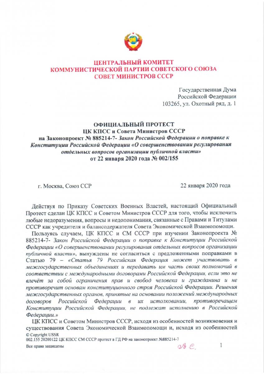 Сегодня последний день для внесения протеста на поправки в так называемую Конституцию, поправки направлены против СЭВ и ЦК КПСС. Скрытый смысл вносимых изменений сводится к тому, чтобы хоть на сутки поставить РФ-ию выше СЭВ и межгосударственных договоров, заключенных в рамках СЭВ в «применимом законодательстве», обеспечить конфискацию и изъятие 6.5Т золотых советских переводных рублей, составляющих баланс СЭВ и перевести серверы МИБ и МБЭС в Венгрию. (Точнее, нажать кнопку и перехватить управление серверами и активами, так как они уже незаконно слепили зеркалки и содержат их фейковые офисы в Будапеште.)