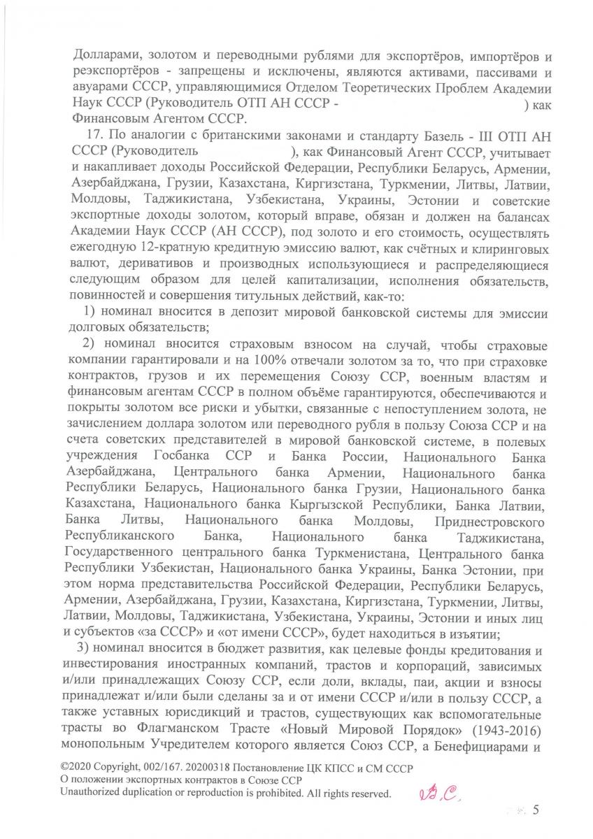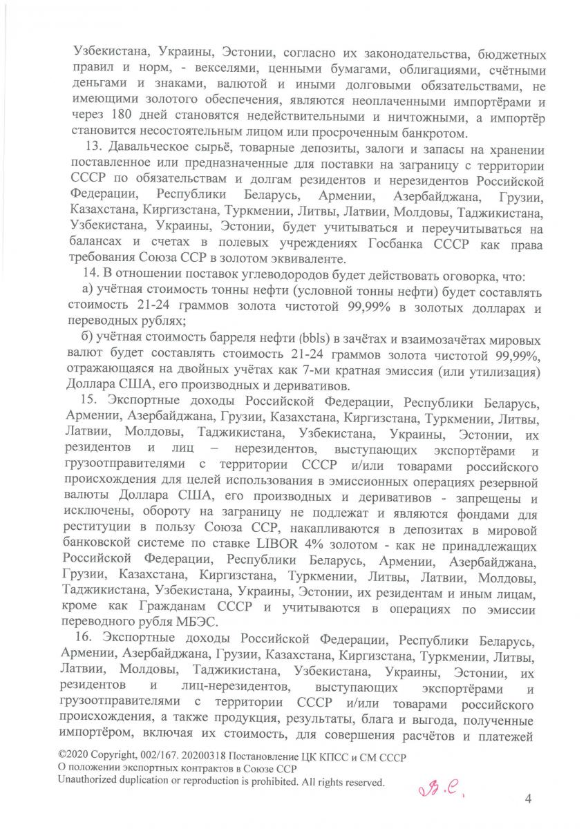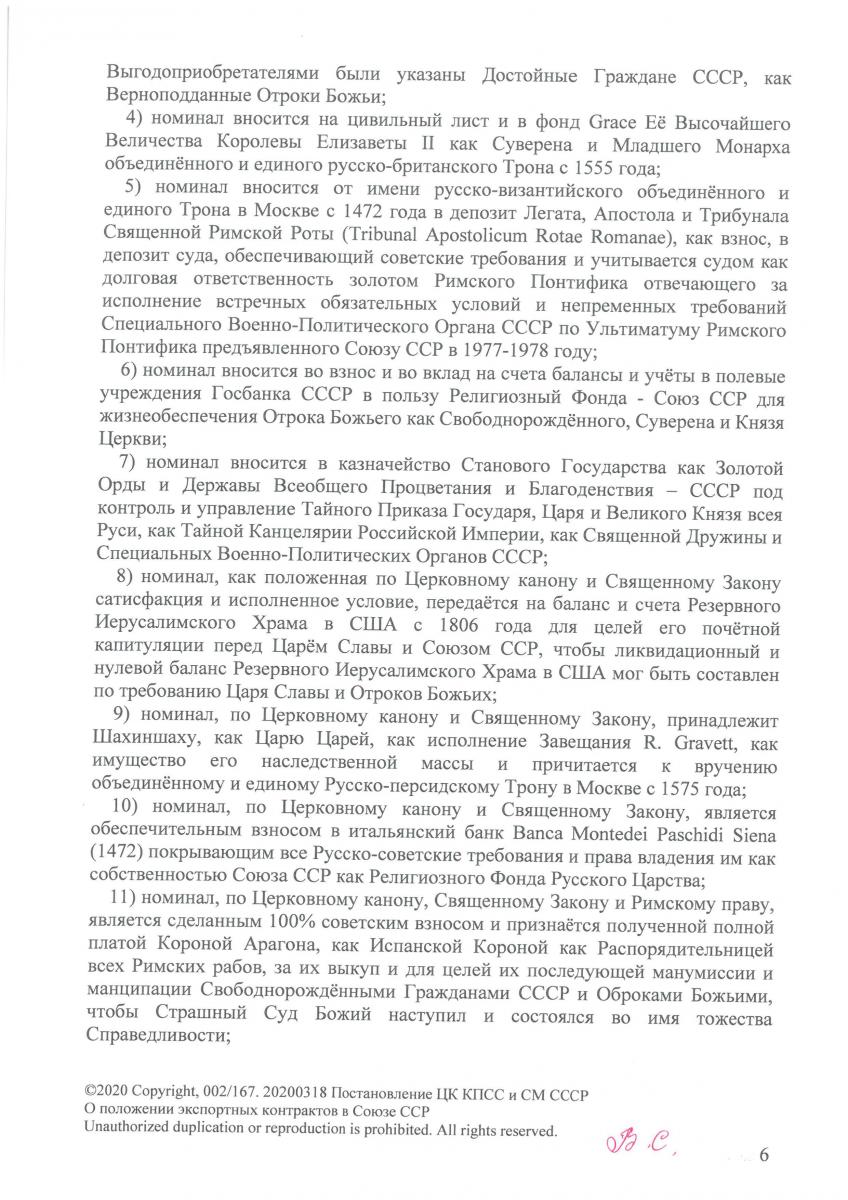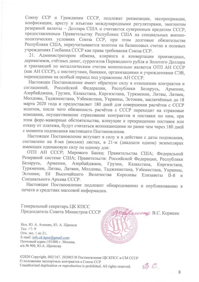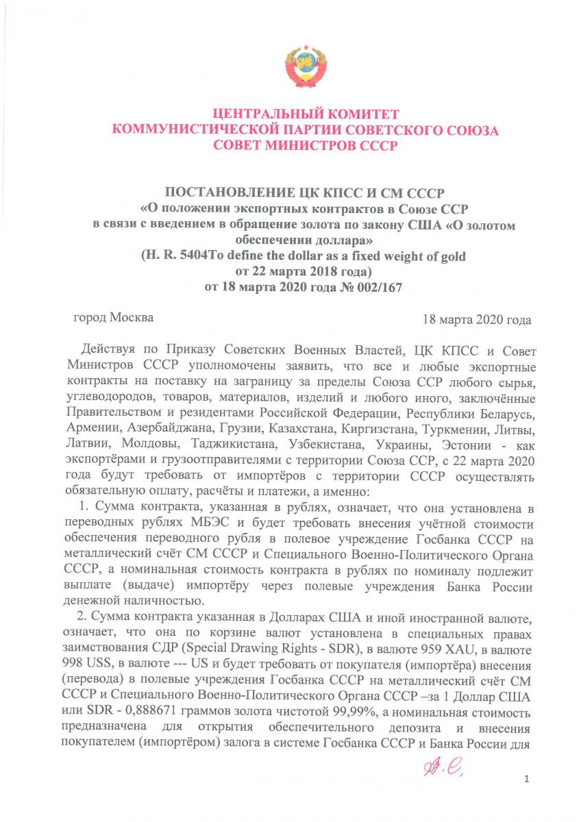«О положении экспортных контрактов в Союзе ССР в связи с введением в обращение золота по закону США «О золотом обеспечении доллара» (H. R. 5404To define the dollar as a fixed weight of gold)от 22 марта 2018 года» от 18 марта 2020 года № 002/167», - для его немедленного, надлежащего, безусловного, безоговорочного рассмотрения, акцепта, присоединения, признания, совершения всех надлежащих и титульных действий или принесения протеста Союзу ССР, его властям и компетентным органам по применимому законодательству Российской Федерации/России с целью безусловного, немедленного исполнения всеми должностными, служащими, замещающими и любыми иными лицами Российской Федерации/России, состоящих в советском гражданстве и принявших Воинскую Присягу СССР - Законов СССР "Об уголовной ответственности за воинские преступления" и "Об уголовной ответственности за государственные преступления" от 1958 года по УК СССР (РСФСР).