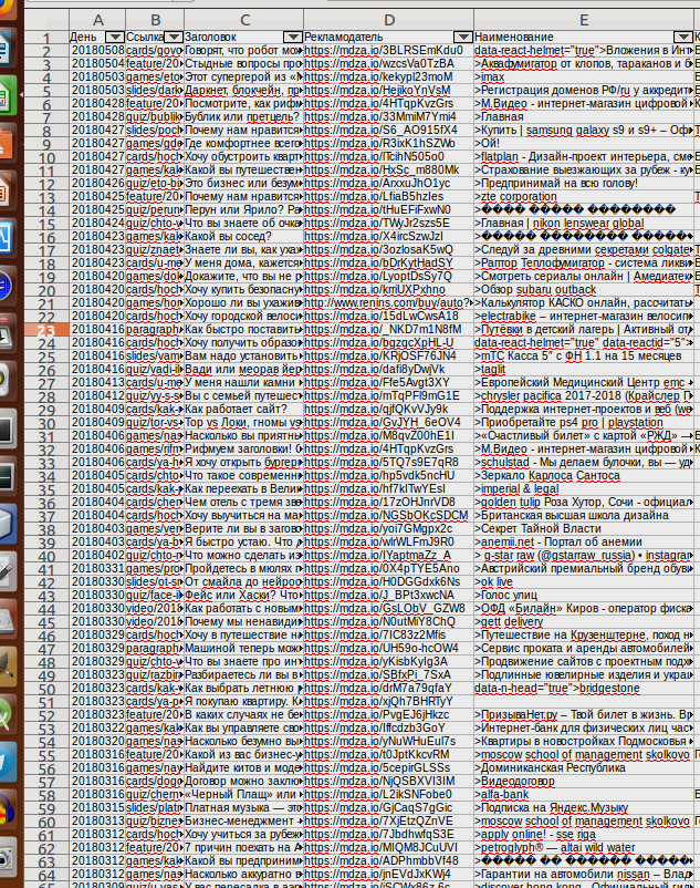 Дичайшие - 600 тысяч в сутки. Считай следом за ВГТРК с РИАН идут. В контексте рассуждений про российский политютюб [https://romansmirnov.org/69 ] - читатели пишут, что увы пока нецелесообразно - все "патриоты" так и будут просить пожертвования на интернетпаперти и сбивать копеечку у пиндосовского гугла :)))...чтобы оценить, а как собственно у этих - сделал скрипт, который вытащил всех рекламодателей, разместивших у них там платные партнерские материалы. Они то как раз "гугл" или "яндекс" не кормят - исключительно прямые продажи.