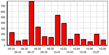 Мы решили посмотреть, кто и как пишет в Твиттере о Russian hackers, собрали порядка 4000 публикаций за последние две недели и построили следующую гистограмму.