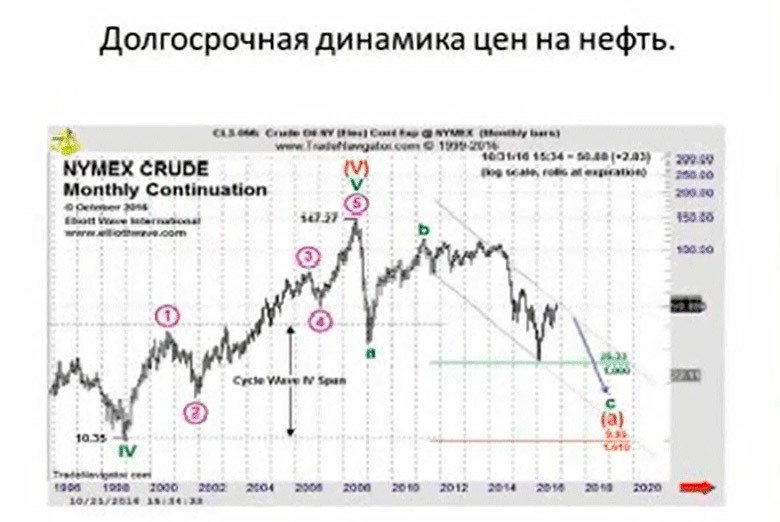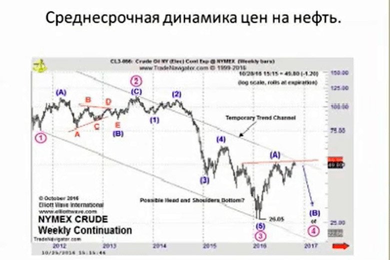 Два месяца назад Пректер выпустил «теоретика», где они взяли свои прогнозы по нефти за последние 30 лет и популярно на графиках показали, как работают прогнозы теории Эллиотта, и что потом происходит с нефтью. Результаты в среднесрочной перспективе — год, два — просто поражающие. Попадание 100%. За 30 лет. Причём Эллиотт ловит и существенные низы, и существенные верхи, и всё остальное. А весь фундаментальный анализ, который основан на балансе спроса и предложения — они [команда Пректера] над ним просто смеются. И правильно делают. Потому что нефть была 120, потом была 30, а мировой баланс спроса и предложения изменился, может быть, на 2-3% в ту или иную сторону. Если вы пытаетесь этим объяснить падение нефти в 4 раза, то, наверное, вы не на правильном пути. Их разметка, с которой я в данный момент согласен, говорит, что в среднесрочной перспективе (год, полтора) мы будем видеть цены, которые значительно ниже существующих уровней.