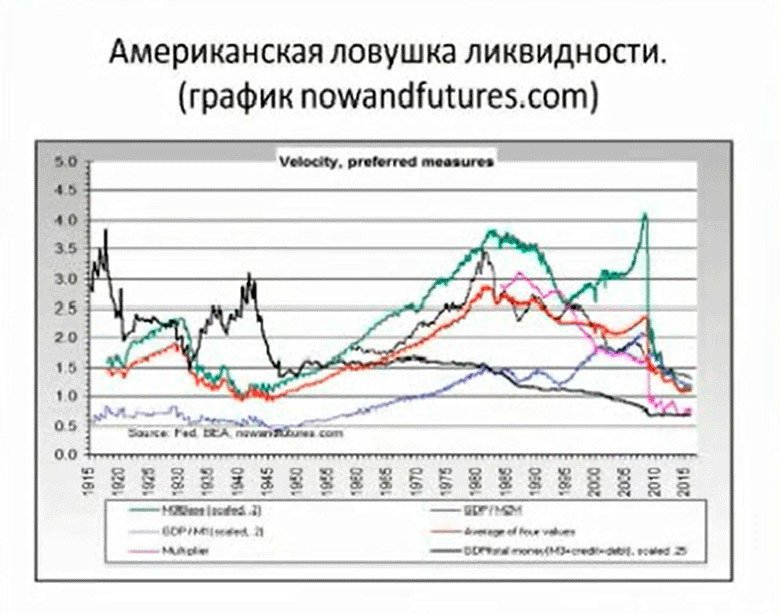 Что мы наблюдаем с «Мировой скоростью обращения денег»? Мы наблюдаем практически ловушку ликвидности. Центральные банки всего мира накачивают экономику и банковскую систему деньгами, долгами новыми, но этот долг имеет отрицательную эффективность. Он растёт значительно быстрее, чем реальный сектор. То есть в реальный сектор практически не поступает. И свою функцию стимулирования конечного потребления и производства не выполняет. Это ситуация во всём мире.