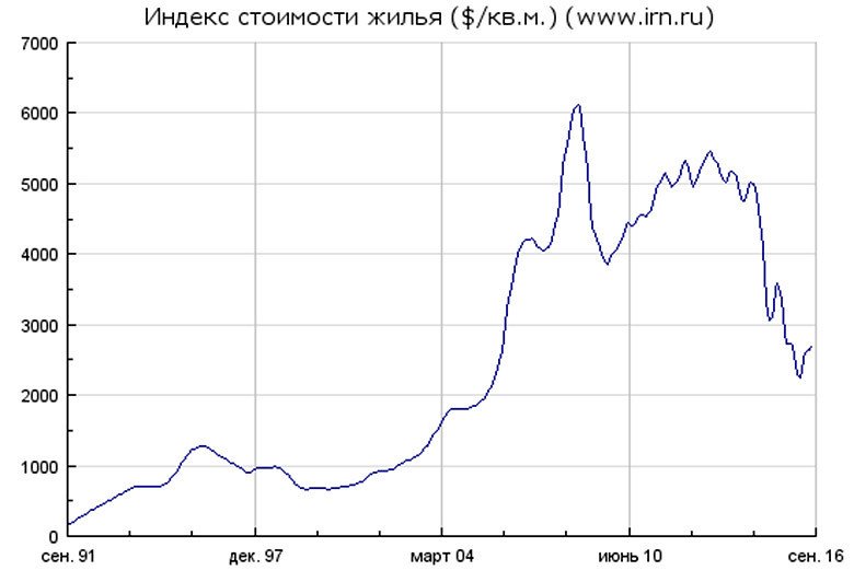 Сейчас идёт какая-то коррекция в долларах. За счёт укрепления рубля. А потом падение продолжится. Первая цель — где-то 1600 [долларов за квадратный метр в Москве]. В рублях она выросла. Но, если вы посмотрите на график рубля и график недвижимости, сразу бросается в глаза, что рубль обесценивается по отношению к доллару значительно быстрее, чем растёт недвижимость в рублях. Покупательная способность одного квадратного метра будет падать.
