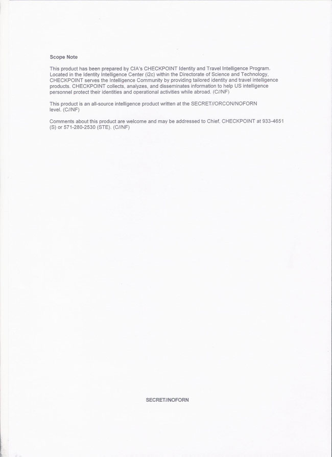 Этот продукт был подготовлен Разведывательной программой КПП-идентификации и путешествий ЦРУ. Расположенная в Идентификационном разведывательном центре (i2c) в рамках Управления науки и технологий, КПП-служит разведывательному сообществу предоставляя сделанные на заказ идентификационные и проездные разведывательные продукты. КПП собирает, анализирует и распространяет информацию, чтобы помочь американским сотрудникам спецслужб защитить свою идентификацию и оперативную деятельность за рубежом. (С // NF)