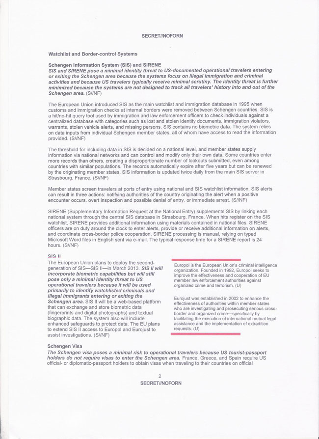 SIS и SIRENE представляют минимальную угрозу идентификации США-документированных оперативных путешественников въезжающих или выезжающих в Шенгенскую зону, поскольку системы сосредоточены на незаконной иммиграции и преступной деятельности и, потому, что американские путешественники, как правило, получают минимально внимательный осмотр. Угроза идентификации [ личности ] дополнительно уменьшена, поскольку системы не предназначены для отслеживания истории всех путешественников в- и из- Шенгенской зоны. (S // NF)