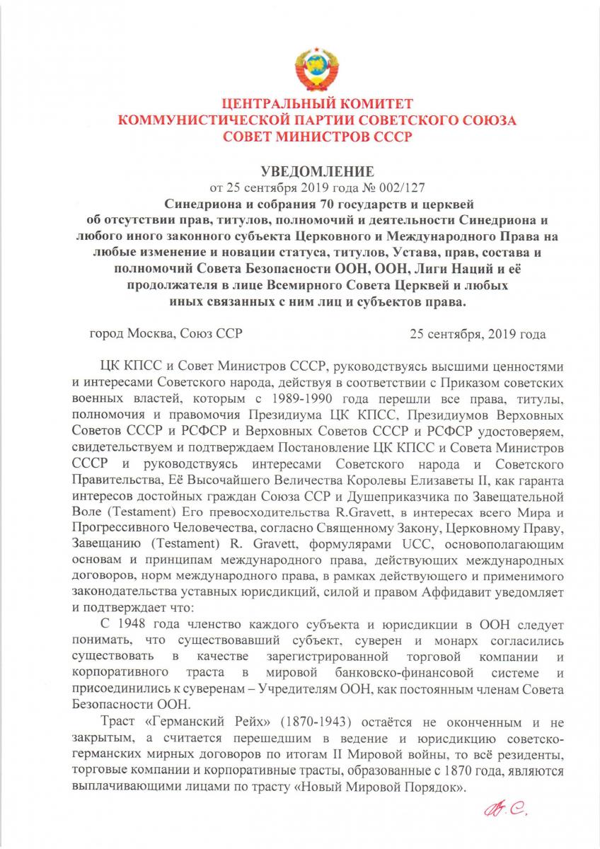 » Уведомление Синедриона и собрания 70 государств и церквей об отсутствии прав, титулов на новации ООН и СБ ООН