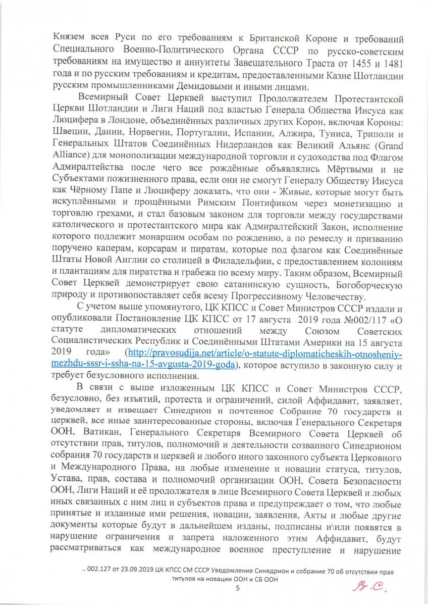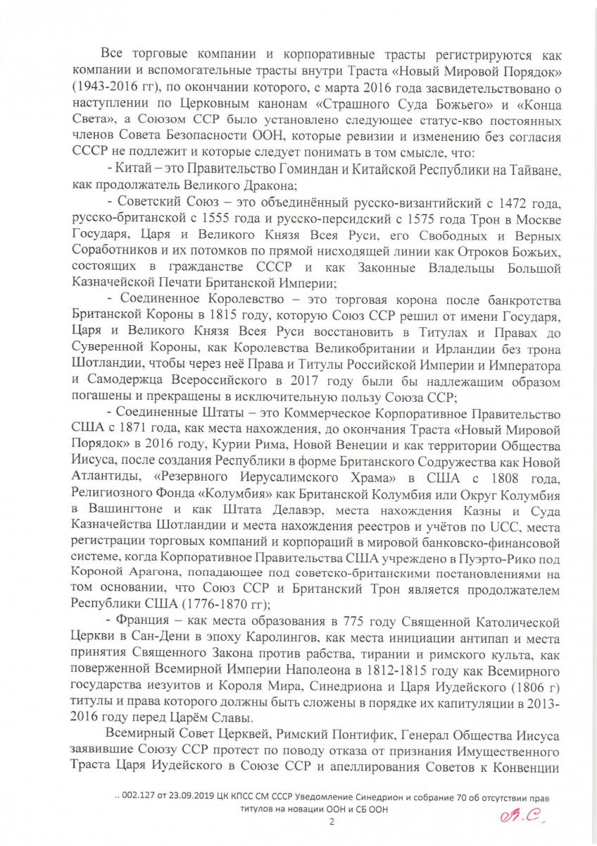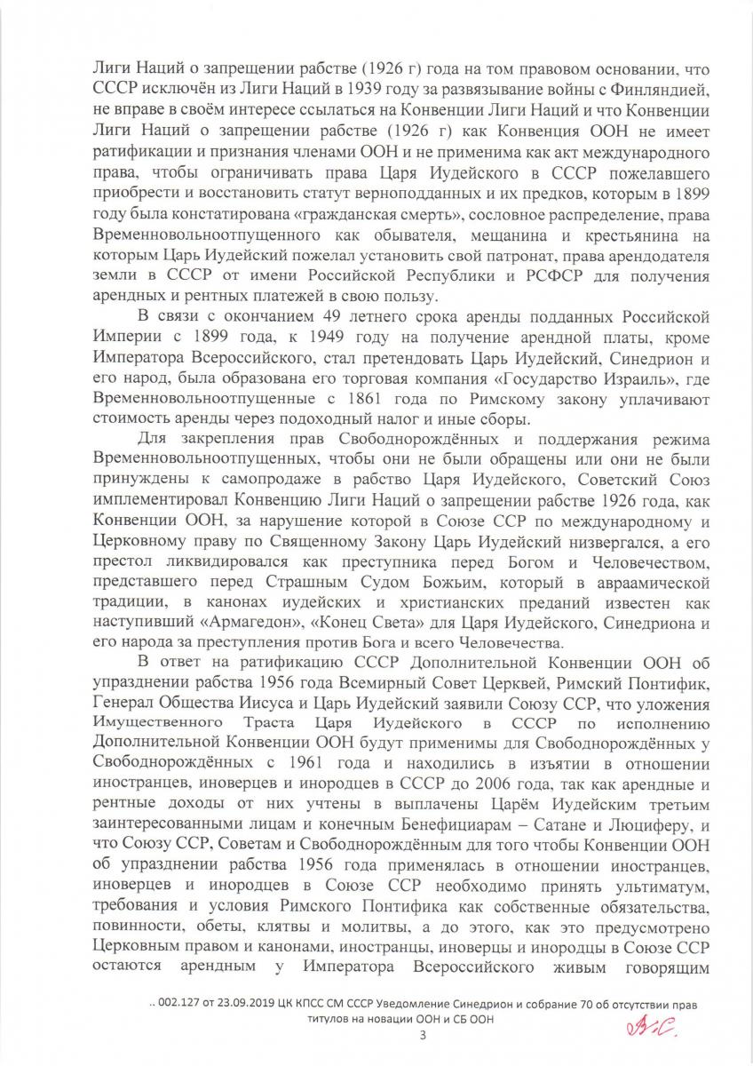 Уведомление Синедриона и собрания 70 государств и церквей об отсутствии прав, титулов на новации ООН и СБ ООН