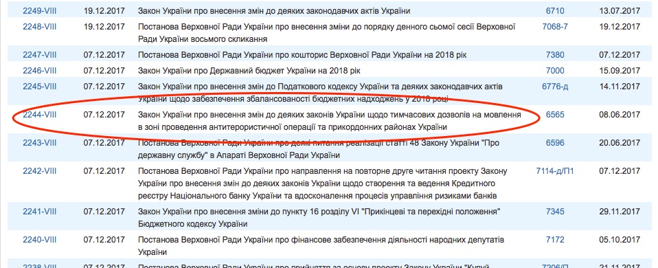 7 декабря 2017 года Верховной Радой Украины было проголосовано Постановление №2244-VIII «О внесении изменений в некоторые законы Украины о временных разрешениях на вещание в зоне проведения АТО и приграничных районах Украины».