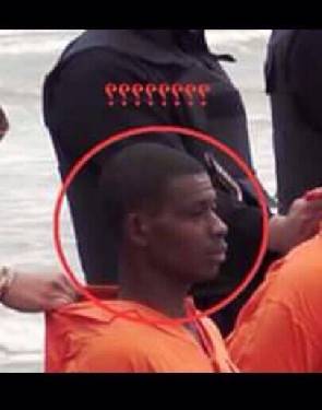 Тот же ливийский эпизод, но особый заложник, не египтянин, а захваченный вместе с ними гражданин Ганы. Палач фиксирует его правой рукой с часами. Бывает. В. В. Путин тоже любит носить часы на правой руке. Правда, золотые часы — несколько странный атрибут для мусульманского фанатика, но не будем привередливыми. Однако добавленные автором снимка вопросительные знаки тоже видны в зеркальном отображении. Таким образом, можно предположить, что остальные снимки по той или иной причине отображены таким же образом. В таком случае всё становится на свои места. Хотя это не столь уж важно, важнее другое.